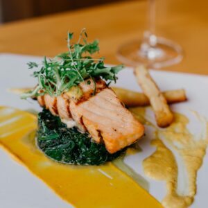 2️⃣ Pan-Seared Salmon – 🐟 Fresh salmon fillet, pan-seared to perfection and served with lemon butter and a touch of aromatic herbs.